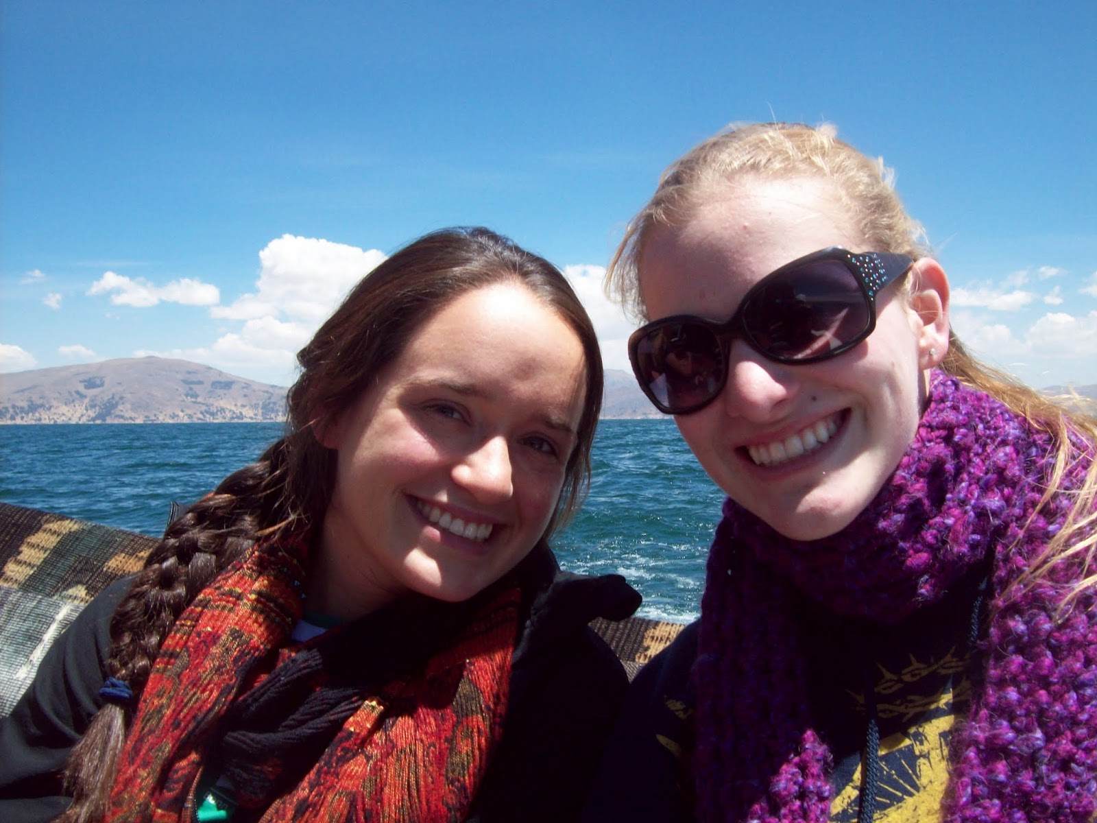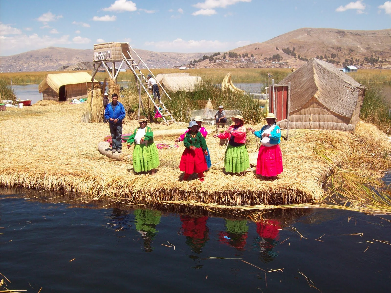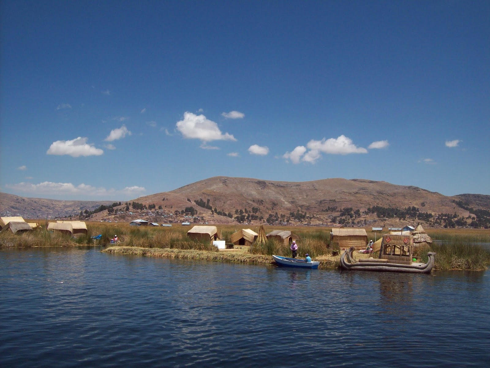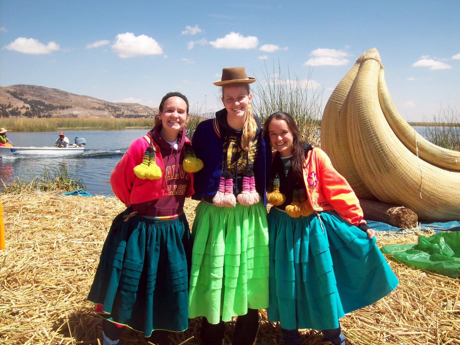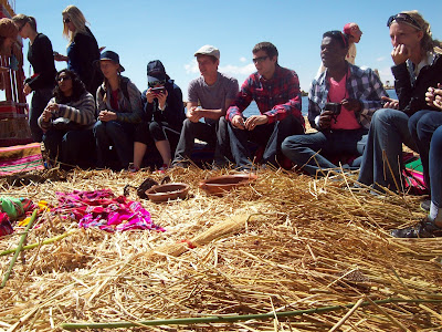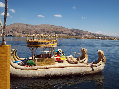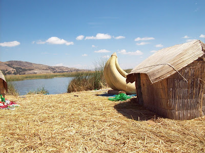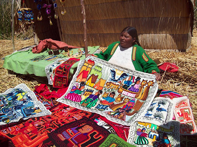 So, the floating islands. They are about 30 minutes from shore. And they are really man-made and floating. They are made of this water grass stuff that grows in the lake. The people harvest it and use it to make their islands. When you're walking around on them, you can tell that they are floating. They move a bit. The people who live on these islands (ranging from 5 to 25 families per island) live very traditionally. They wear traditional clothing, they live in very small structures and they make a living through the tourists who come to visit. They sell their textiles (which are beautiful).