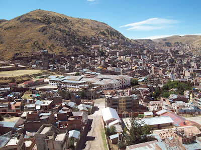 We woke up the next morning and had the best continental breakfast I have ever had in my life! There was enough fruit for an army, and some awesome yougurt and stuff to put in it and juice and breads... it was great. After breakfast, we all boarded the bus and drove to Puno, which isn't too far from Chucuito. Puno is the folklore capital of Peru. It's a decently big city on the shore of the lake, and it's very very high - the elevation is 12,500 feet! We all get altitude pills to take from Professor Zandstra.