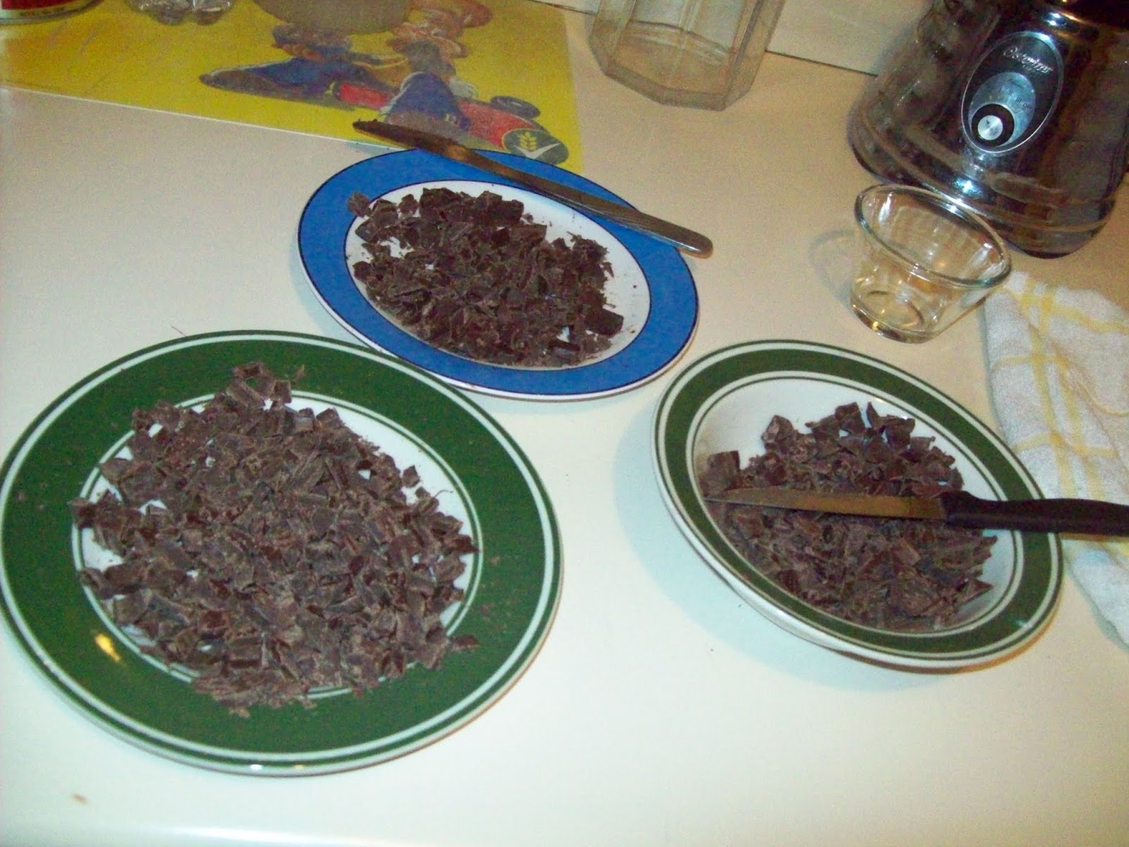 Amy's family graciously offered us the use of their kitchen. We settled down and began to cut the chocolate blocks into chocolate chunks.