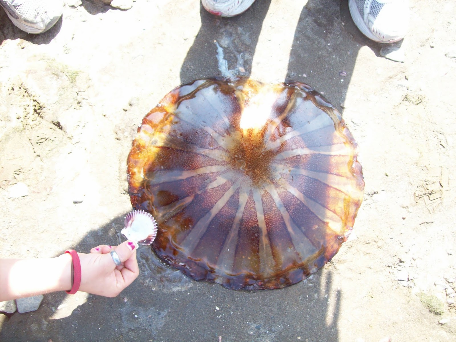 | As we were walking along the beach, we saw this... ball-ish thing. But, we determined, after much careful investigation, that it wasn't a ball. Rather, it was a dead JELLY FISH!!! |