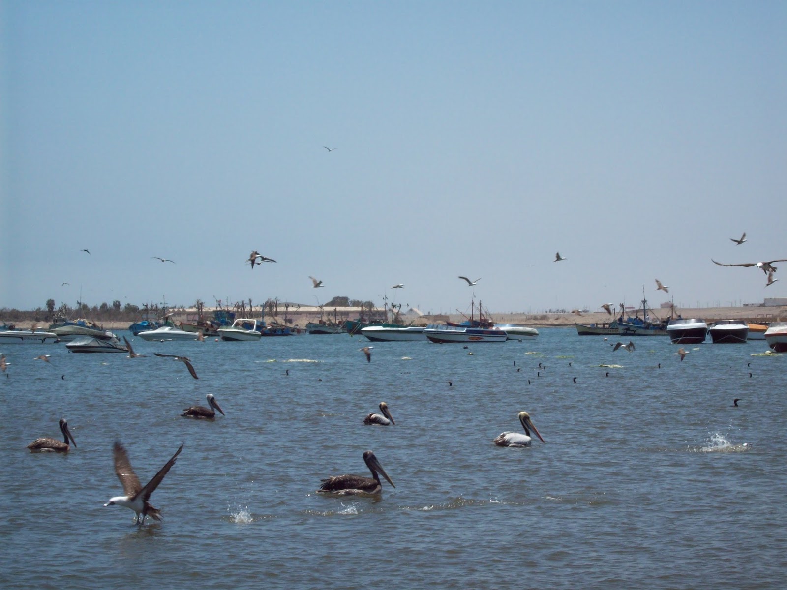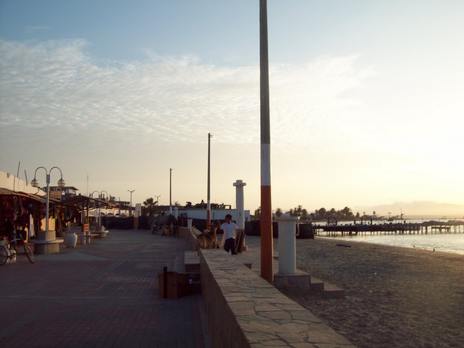 | Here's the shore in Paracas. Theres the beach on the right, and then on the left is a bunch of restaurants. |
