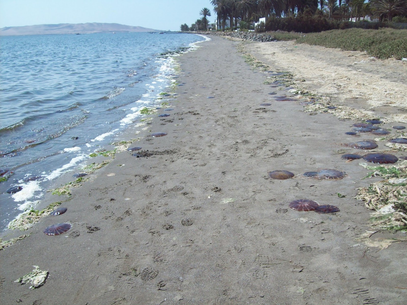| After seeing that first dead jellyfish in the water, we quickly realized that the shores of Paracas were... a jellyfish graveyard! They were EVERYWHERE. I'm not joking! This is one of them! And, I now know from personal experience, that when you accidentally step on them, they slip and slide and it is difficult to not tip over. |