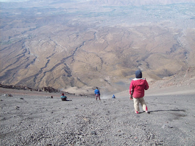 Instead of re-tracing our steps to get back to camp, we took a short-cut. Much of the face of Misti is sand. To get to the summit, we climbed up the rock part, because climbing up sand would be terrible. But going down sand... now that's quite easy. We literally ran down the volcano. It was like one huge sand dune, and we ran all the way to camp. It took us six hours to get from camp to the summit, but it only took us 30 minutes to run from the summit down to camp. Once we got to camp, we packed up our things and did some more running down a volcano, this time with our backpacks! At the very end, we had to scramble like mountain goats down parts of the trail that we had climbed up, but we ran down a majority of the volcano on the volcanic sand dunes.
