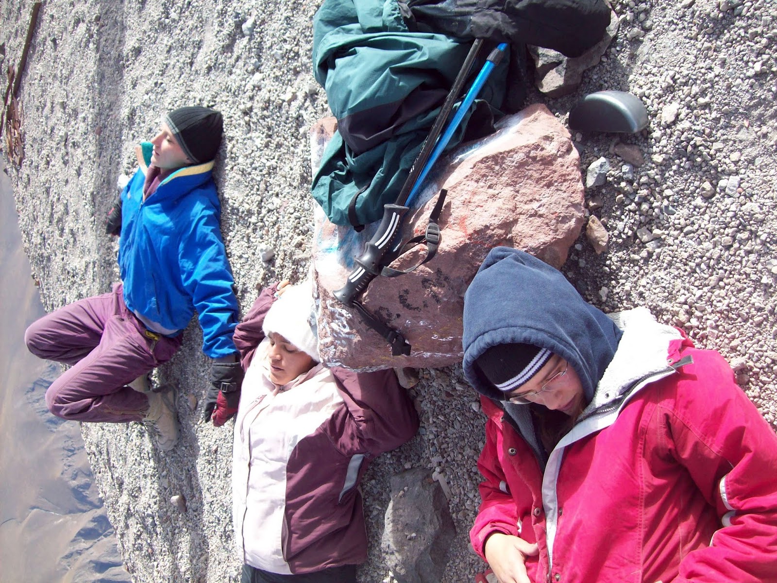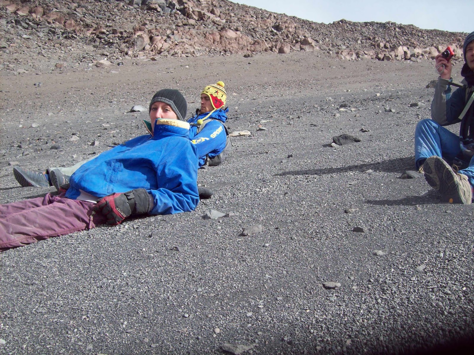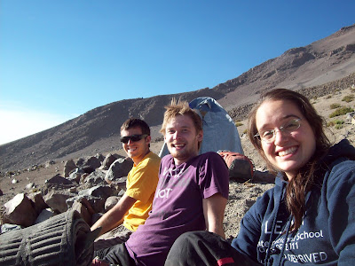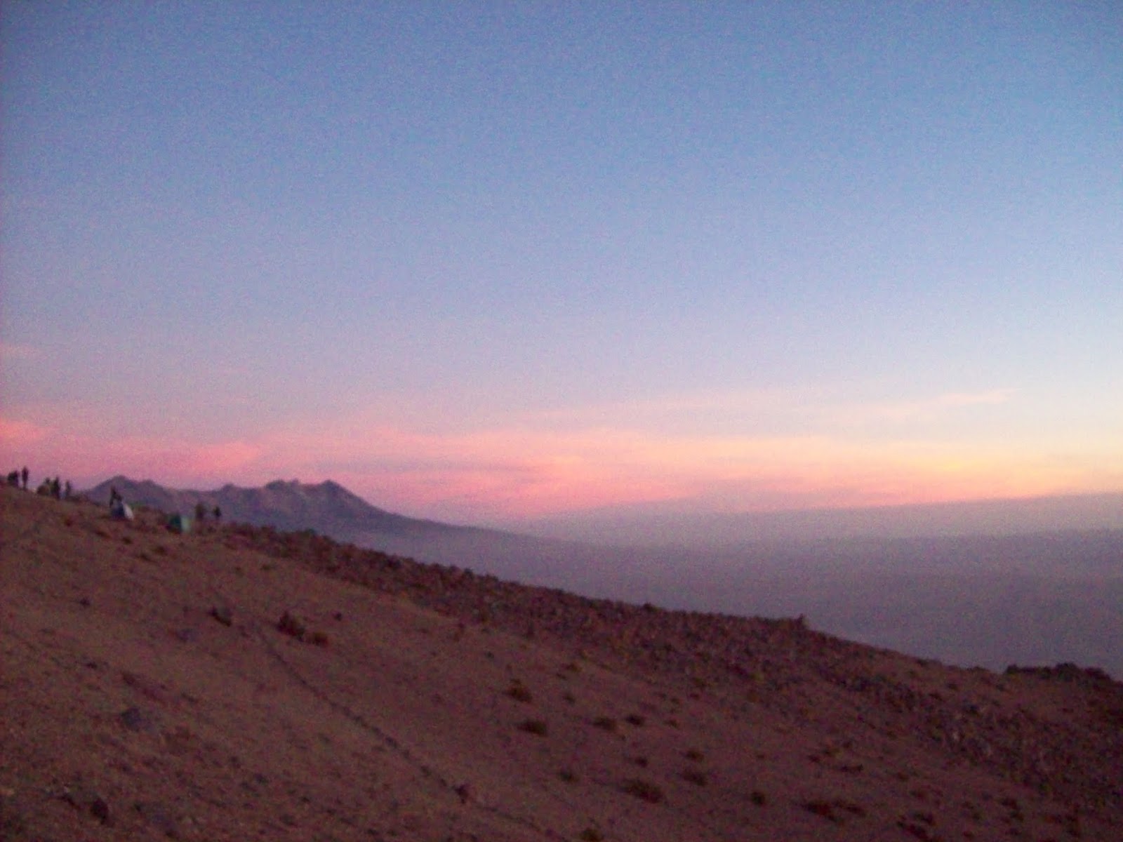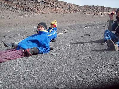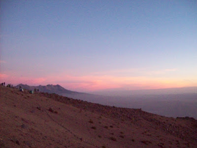 After dinner, we all went to bed. It was early, but it was dark out and quite cold. And we had to rise and shine at 1 AM to continue our ascent. 1 AM came, and we hadn't really slept much. The wind was loud all night, and I think that even though we were exhausted, we were super excited and couldn't sleep. We didn't have to bring our backpacks, today. We just left them at the camp and headed up the volcano. It is VERY good that we didn't need our packs. The climb this morning was even more intense than the first part. The path was incredibly steep, and the altitude made everything harder. We hiked for a few hours in the dark, by the light of our head lamps. We were all physically exhausted. But the sunrise was really pretty!!