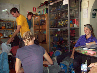 Our adventure began on Saturday morning when we went to the outfitter place. We packed our back packs, and then packed ourselves into a large vehicle and drove off to Misti! Getting to Misti involved driving on a very rugged road for about 30 minutes. I'm impressed (and relieved) that our vehicle did not tip over. We were very close a few times.